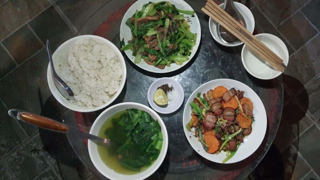 So we had a cozy night, full of indigenous food like local beef soup (Thắng Cố bò), dried pork (Thịt lợn gác bếp) and veggie stir-fried with onion (rau xào tỏi). The food got chilled quickly due to the low temperature at night so we rushed to finish a bit. But it was still yummy and got us full.